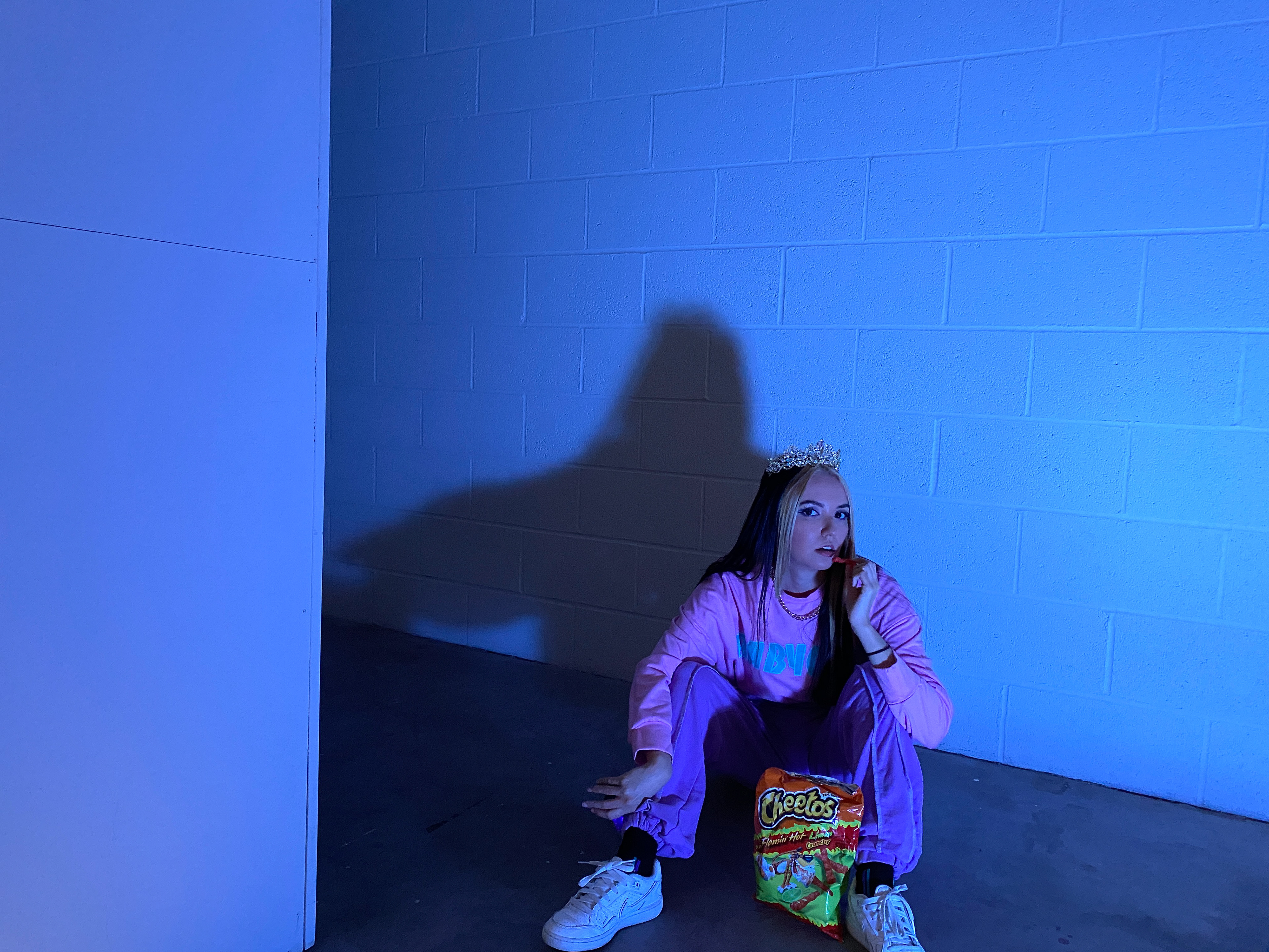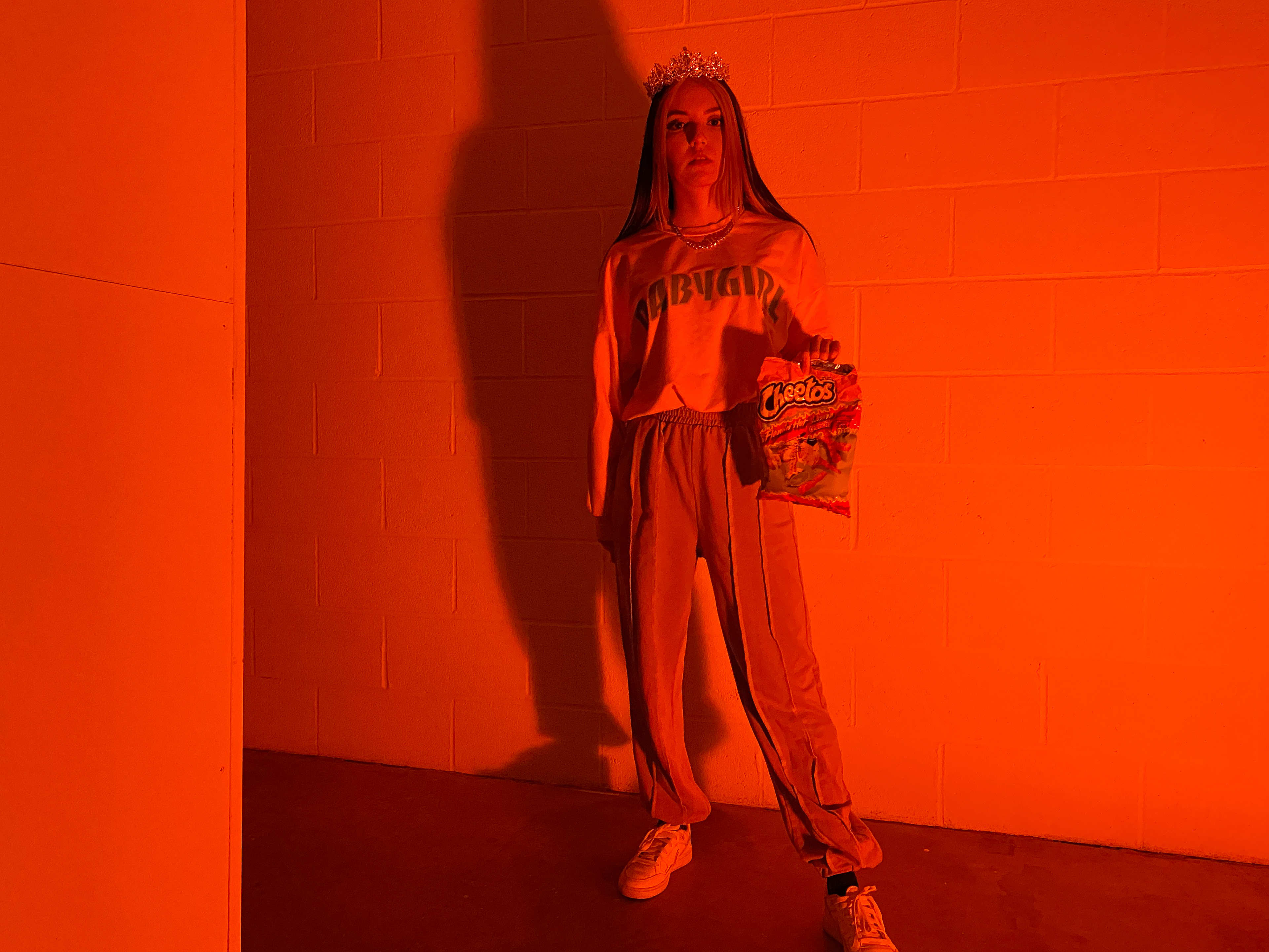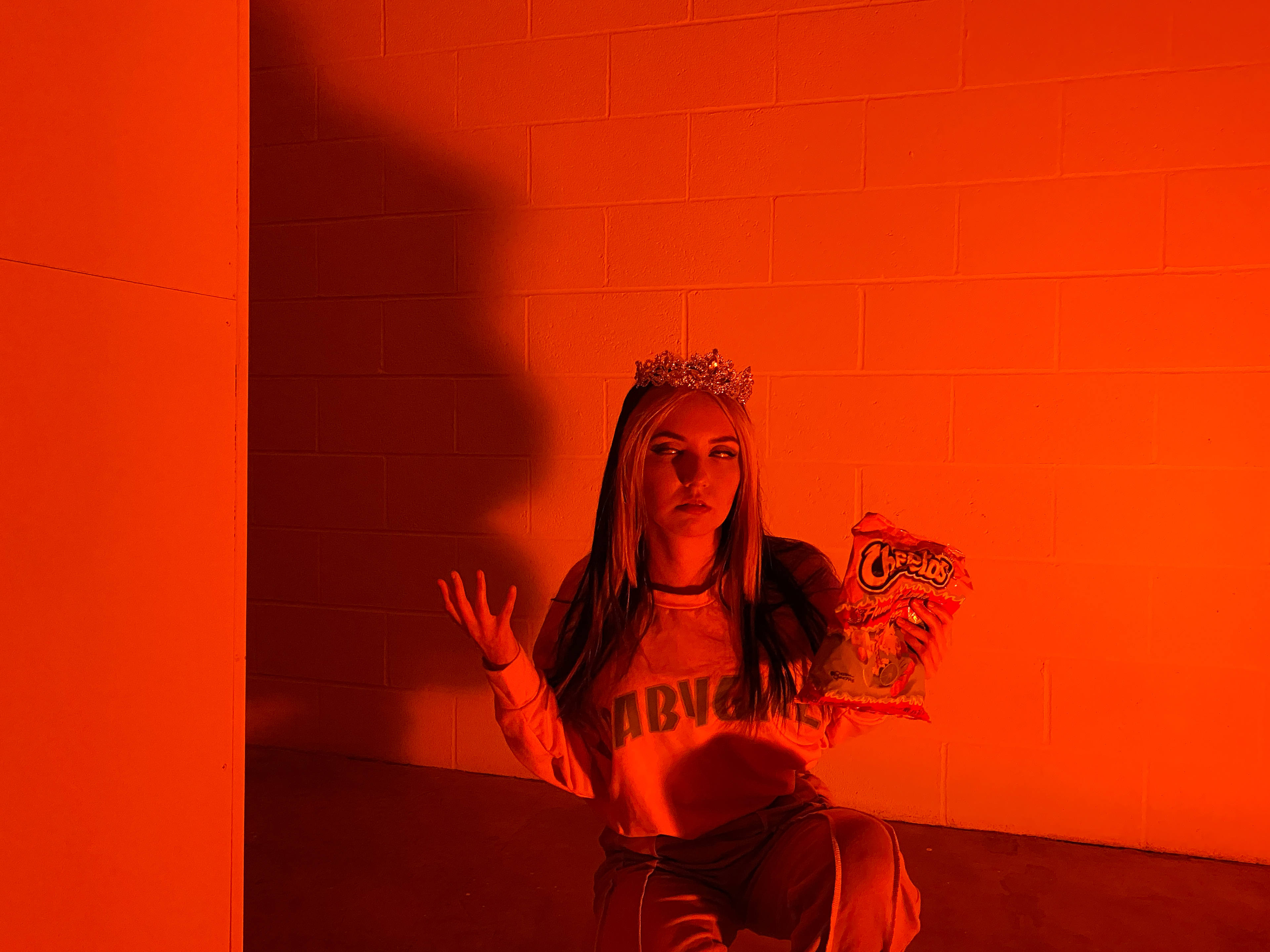 Using irony to make fun of the stereotypes of Latinas. The Hot Cheetos symbolize that all Latinas love Hot Cheetos and that they are fiery and hot. This is not always true, but I am using it to make fun of them and at the same time to empower my identity.